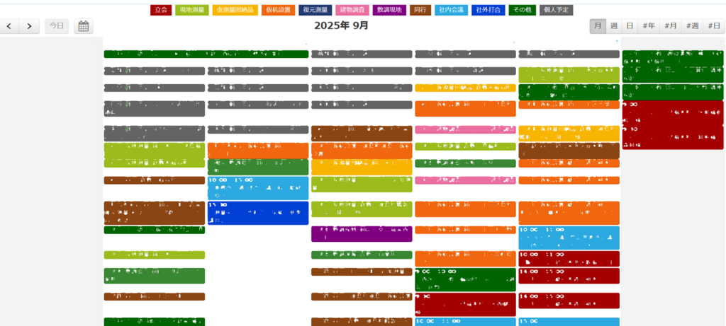 弊所ではカレンダープラスを使い、カレンダー形式で担当者と内容と項目別に色分けを行っており、案件管理アプリと連動させて利用しています。