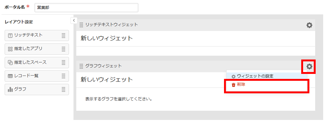 3.配置したウィジェットを削除する場合は、ウィジェットで[設定]アイコン(歯車の形)をクリックし、[削除]をクリックします。