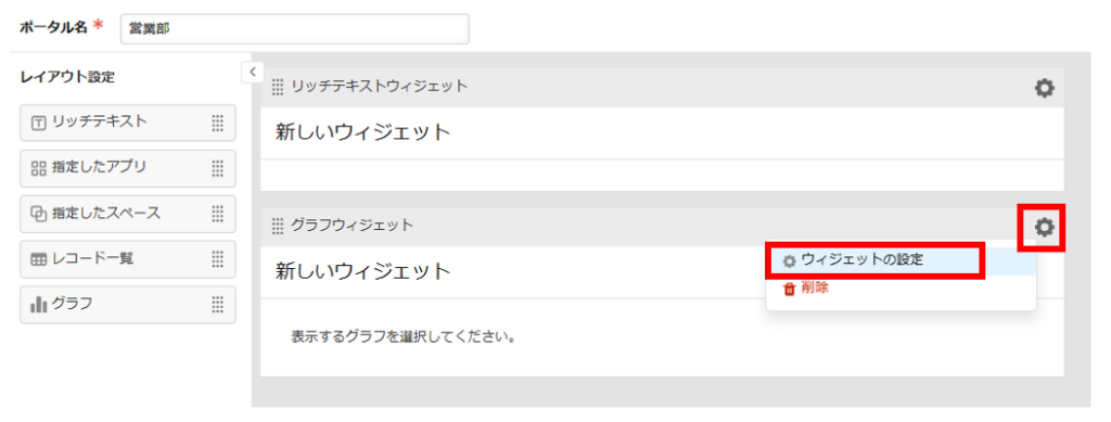 上記のウィジェットの配置はいつでも編集できるので、「このグラフを一番目立つ場所に移動しよう」「最新のお知らせをトップに持っていこう」といった変更が、誰でも数秒で完了します。