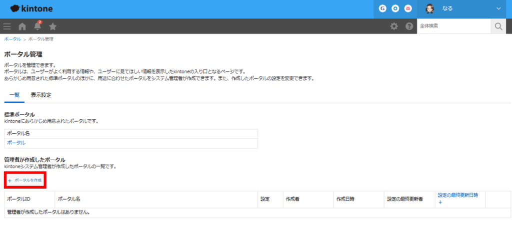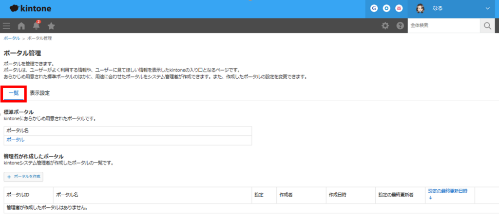 2.[ポータル管理]画面の[一覧]タブをクリックします。