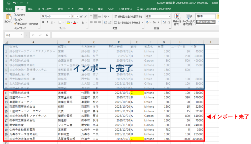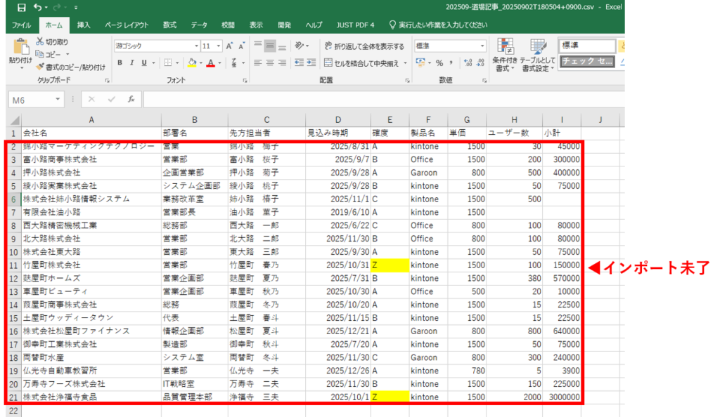 このファイルをインポートすると、空白にしていた行が新規登録されます。
