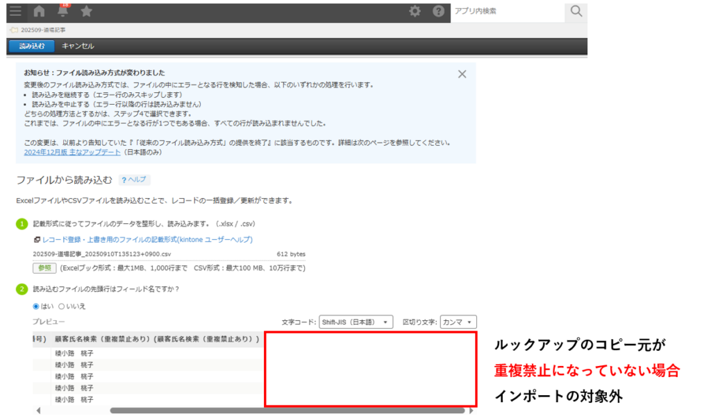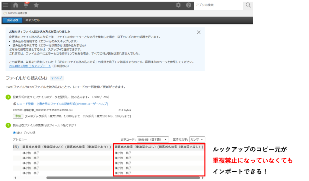 新しい読み込み方式では、ルックアップのコピー元フィールドが重複禁止になっていない「氏名(重複禁止なし)」フィールドにも、インポートすることができます。