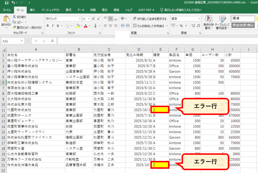 たとえば下図のように、11行目と21行目にエラーが出てしまうデータをインポートしたとします。