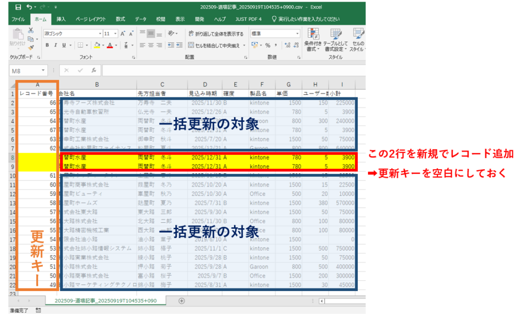 新しいファイルでは、「更新キー」が空白であれば新規登録の行、「更新キー」に値が入っていれば一括更新の行と認識できるようになり、1つのファイルで新規登録・一括更新の両方を実施できるようになりました!