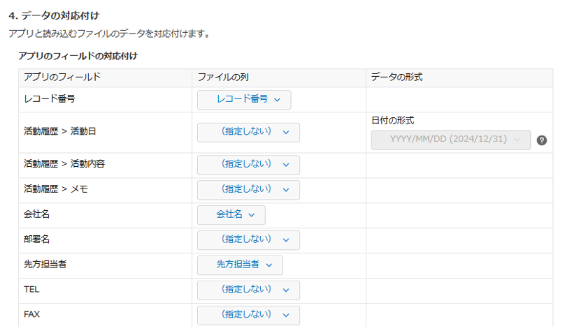 「4. データの対応付け」で、アプリの意図したフィールドにインポートデータの各列が対応づけられているか、確認します。その後、画面左下の「読み込む」を押すとインポートできます。