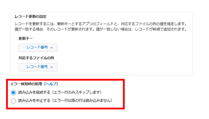具体的には、エラー行を検知した際の処理を2パターンから選択可能になっています。
