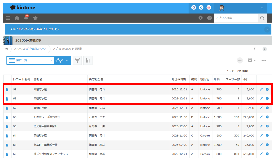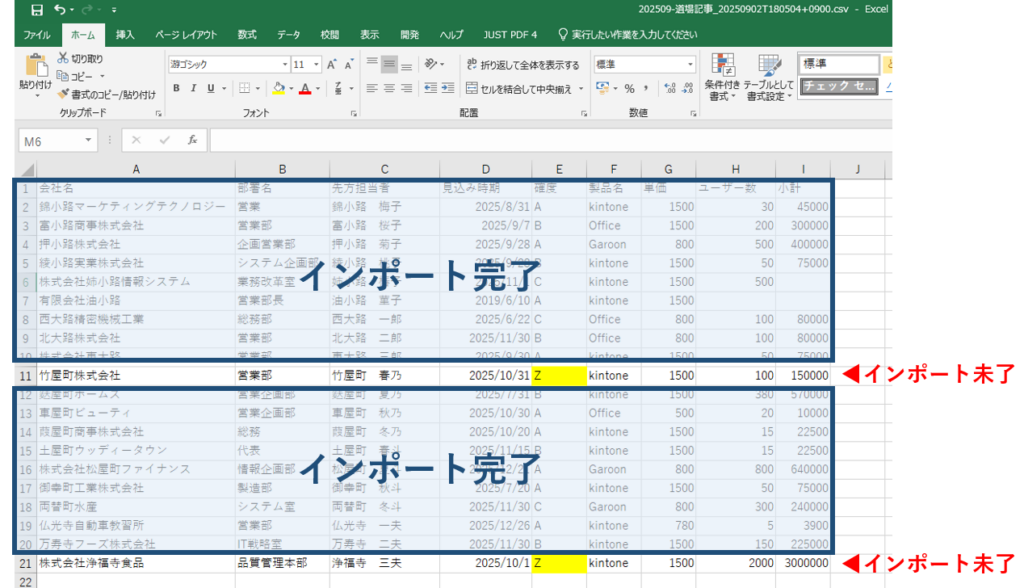 エクセルで用意したインポートデータのうち、11行目と21行目以外はインポート完了させられます!