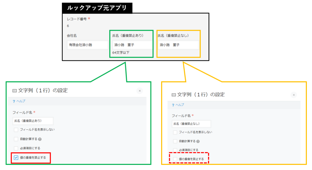たとえば、ルックアップ元アプリで、コピー元フィールドが重複禁止になっているものとなっていないフィールドがあったとします。
