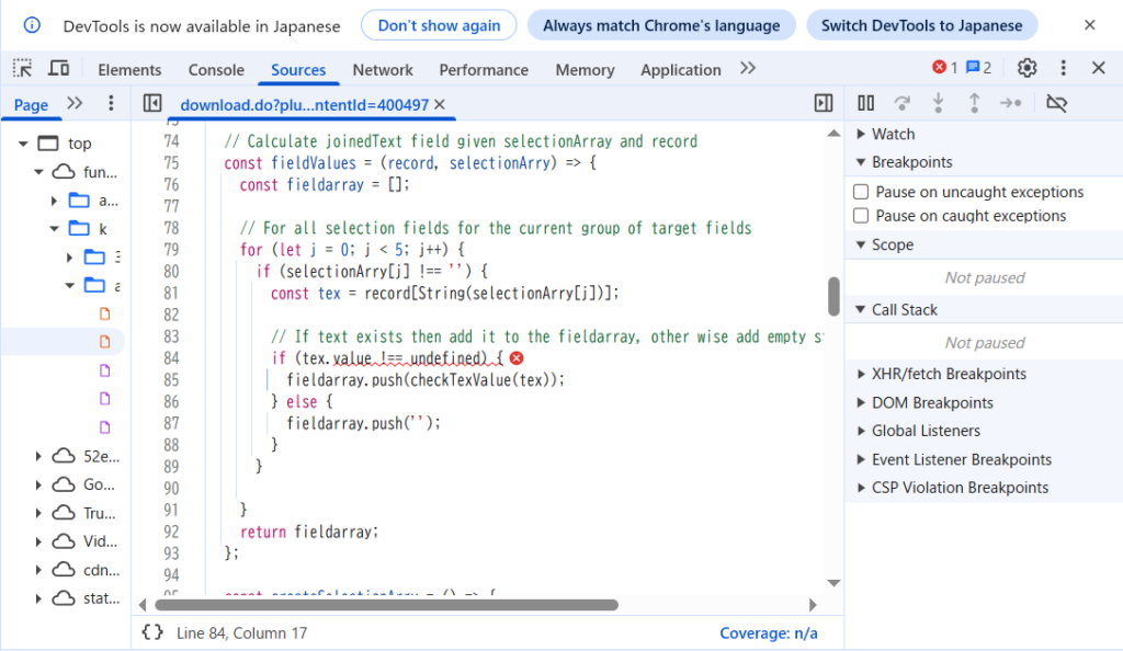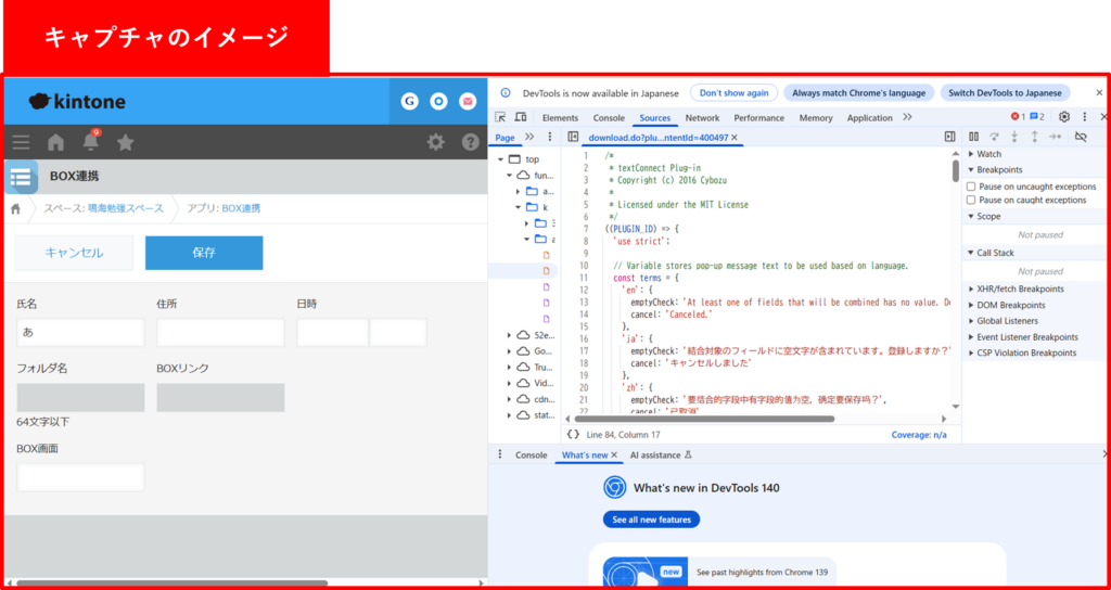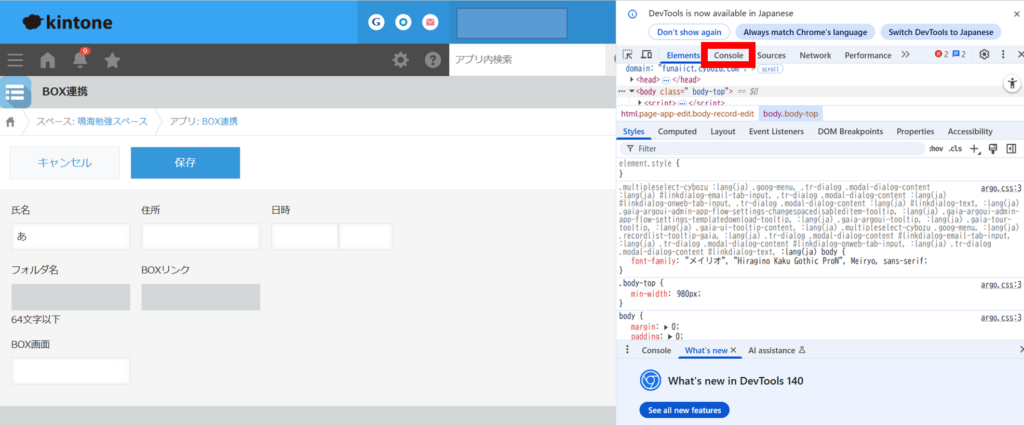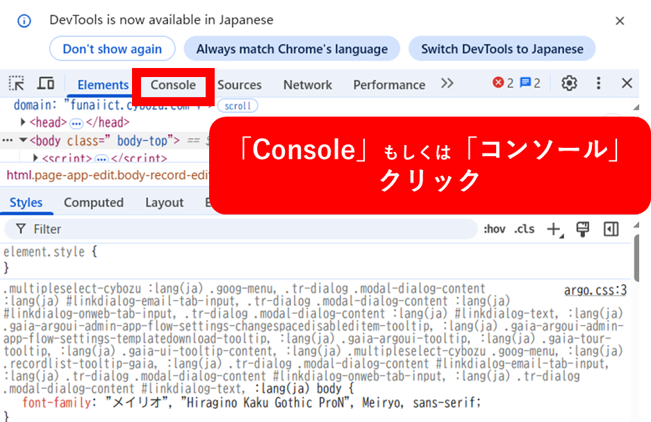 ①の通りにエラーの再現が出来たら、いよいよ「コンソール画面」を表示します。