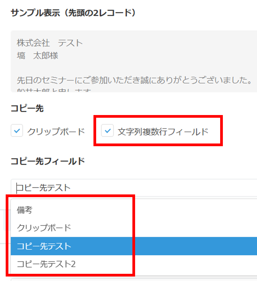 設定画面で「文字列複数行フィールド」にチェックをつけ、下に出てくる文字列複数行フィールドからコピー先にしたいフィールドを選択するのみです!