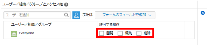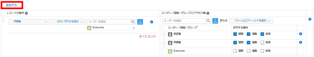 [フォームのフィールドを追加] の代わりに、[ユーザーを追加] をクリックし、経営者・管理者・上司などすべてのレコードを閲覧できるユーザーや組織、Administratorsグループを追加するのもOKです。