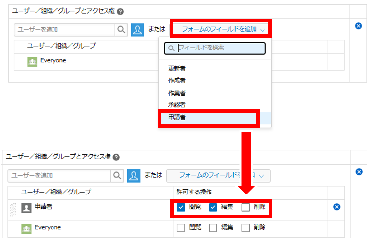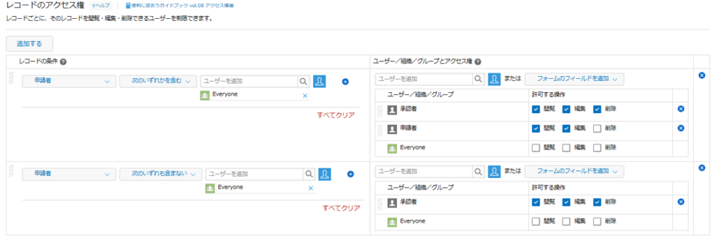 そのため「申請者」が空欄の場合も、「承認者」だけにしか表示されないようにアクセス権を設定しましょう。