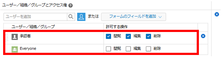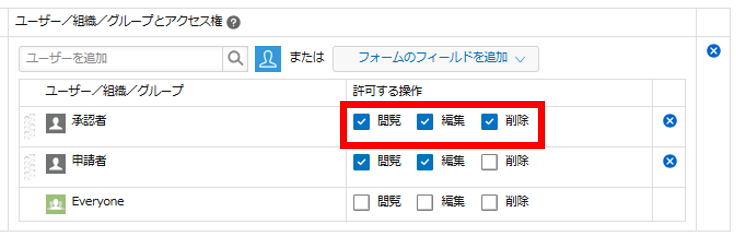 13.右側の権限の設定では「Everyone」の閲覧・編集・削除権限をすべて外し、「承認者」の閲覧・編集・削除権限すべてにチェックをつけます。