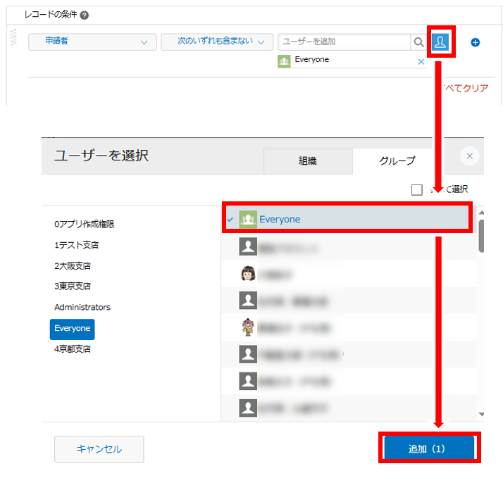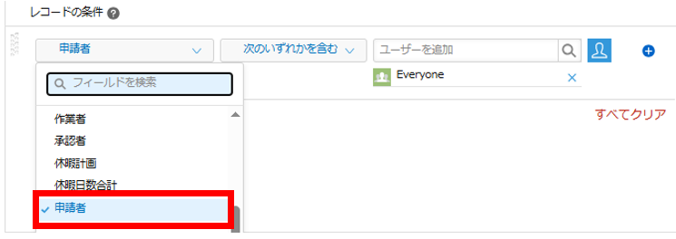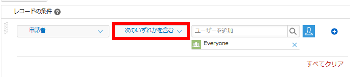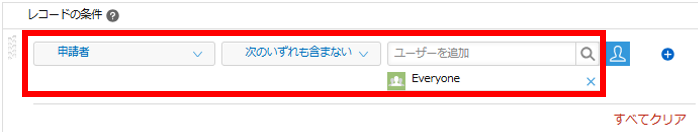 12.左側のレコードの条件で、「申請者」フィールドを選択し、条件に「次のいずれも含まない」を選択します。対象には「Everyone」を選びます。