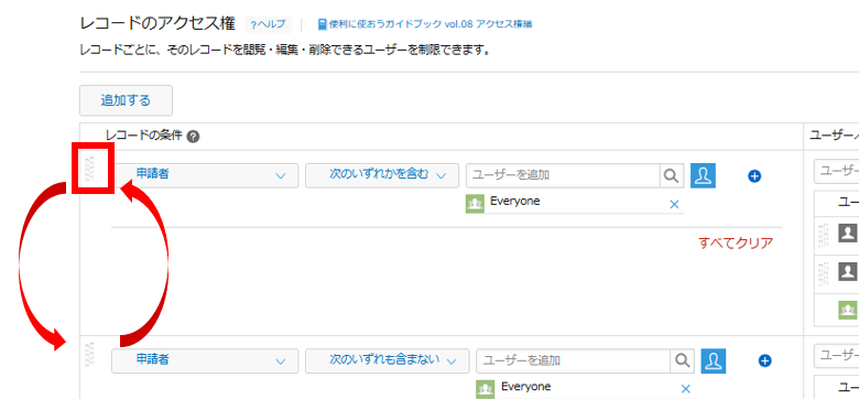 レコードのアクセス権では複数の条件を設定でき、上にある条件の設定が優先されます。