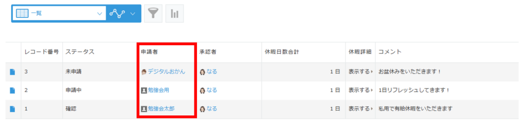 今「デジタルおかん」のアカウントでkintoneにログインしているため、申請者が「デジタルおかん」になっているレコードが表示されています!