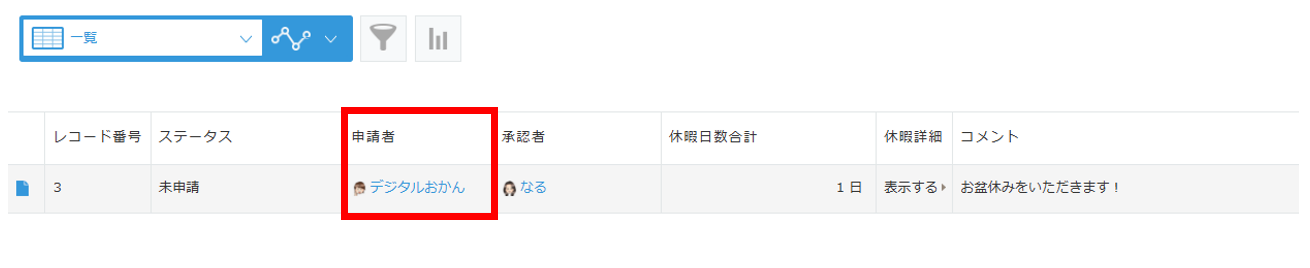 本人(申請者)のみ自分のレコードが閲覧できるようにした時は、下記のように表示されます。