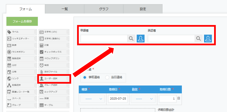 休暇申請アプリは本人(申請者)と管理者(承認者)というユーザー選択フィールドがあります。