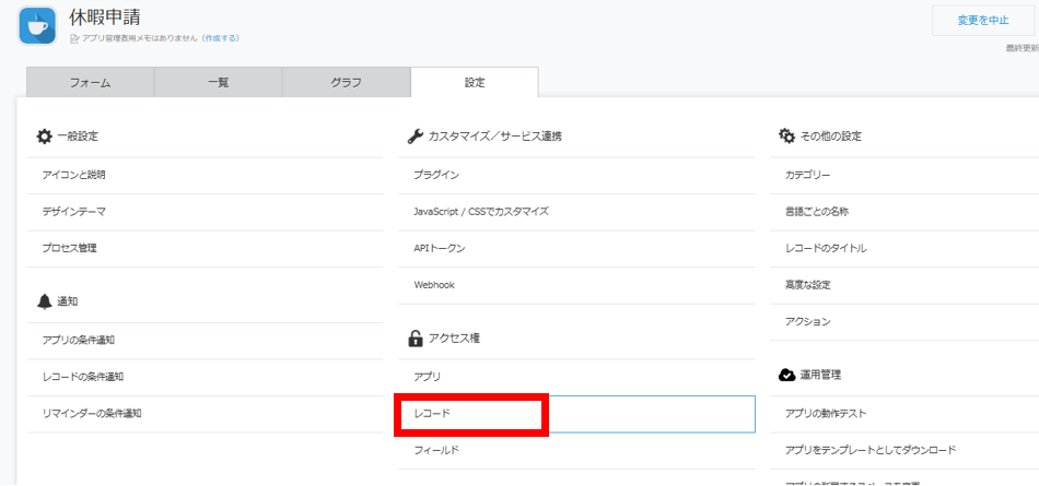 3.[アクセス権]の中の[レコード]をクリックします。
