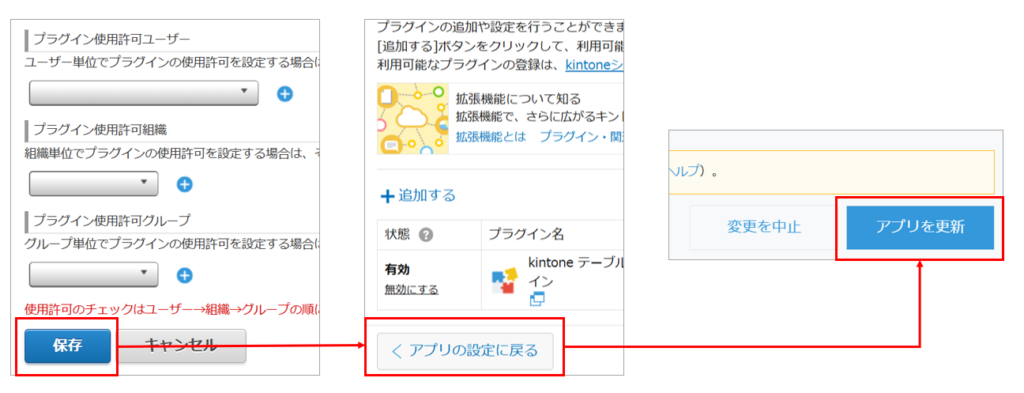 プラグインの設定画面の最下部にある「保存」ボタンをクリックし、アプリの設定画面に戻り「アプリを更新」ボタンをクリックして完了です!