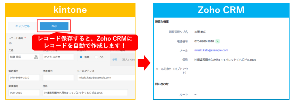 kintoneでレコードを保存・更新した瞬間に、データがZoho CRMへリアルタイムに反映されます。